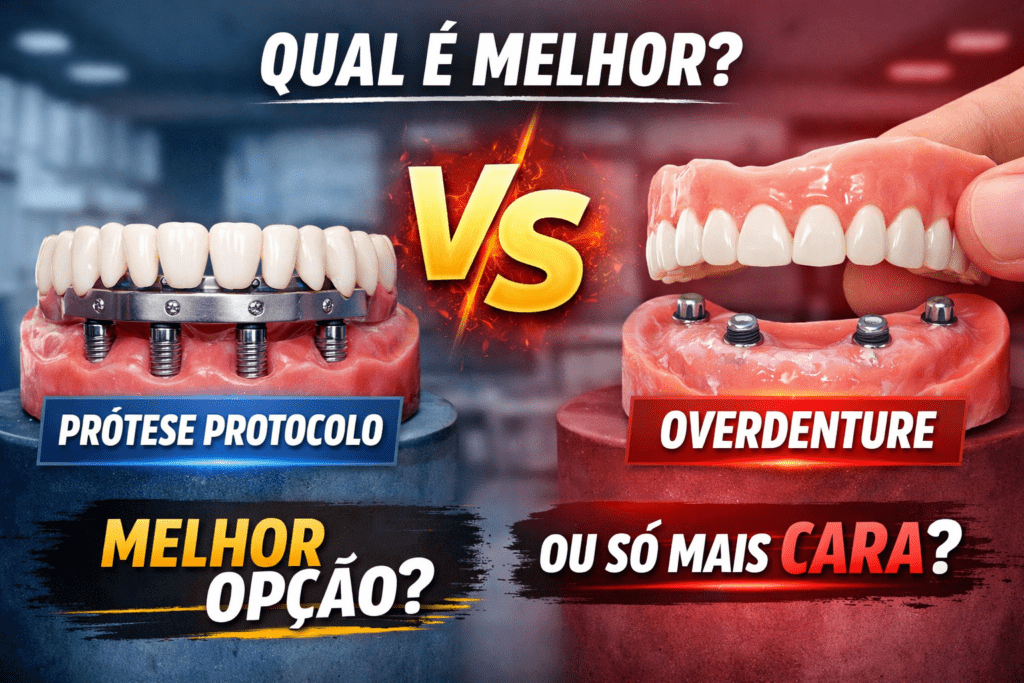Neste artigo, eu vou te explicar sem empurrar tratamento, de forma clara, honesta e profissional, quando a prótese protocolo realmente é melhor que a overdenture — e quando ela NÃO é.